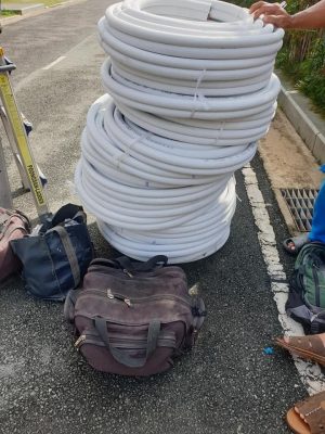 Dụng cụ khoan, tua vít, băng keo, ống dẫn gas, ống thoát nước.