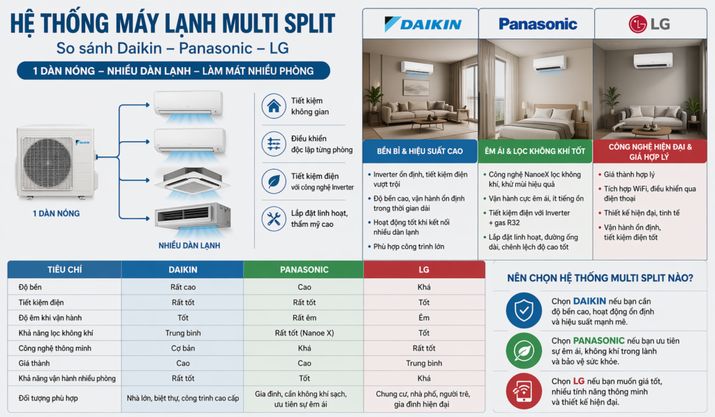 👉 Bạn đang phân vân chưa biết nên chọn hệ thống máy lạnh Multi Split của Daikin, Panasonic hay LG?