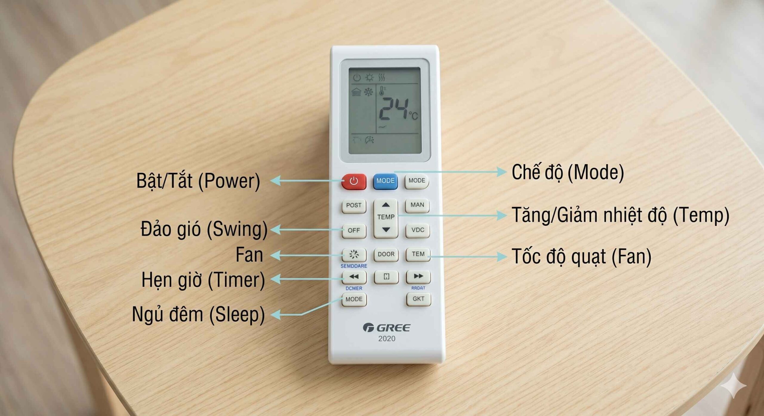 Để bắt đầu làm quen với thiết bị, bước đầu tiên là bạn cần nhận diện và hiểu rõ các phím bấm chức năng. Dòng remote năm 2020 của Gree được thiết kế khá tối giản, bao gồm các nút cốt lõi sau:
