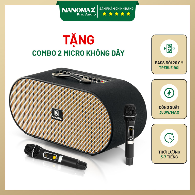 Sản phẩm thuộc dòng loa xách tay cao cấp của Nanomax Việt Nam, sở hữu công suất cực đại 380W, hệ thống 4 loa – 3 đường tiếng, pin lithium 11.1V – 7200mAh, Bluetooth 5.0, và micro không dây UHF có thể điều chỉnh tần số – tất cả kết hợp tạo nên “một dàn karaoke mini thực thụ”.