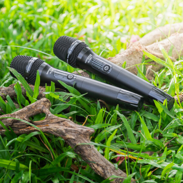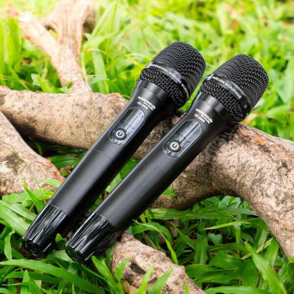 Đi kèm với loa là cặp micro không dây sử dụng sóng UHF cao cấp. Loại micro này cho khả năng bắt sóng xa và ổn định, có thể thay đổi tần số linh hoạt để tránh trùng sóng. Thân micro được làm từ kim loại cầm rất đầm tay, kết hợp với đầu thu hút âm tốt, giúp người hát không bị mệt, giọng hát trở nên bay bổng và nhẹ nhàng hơn.