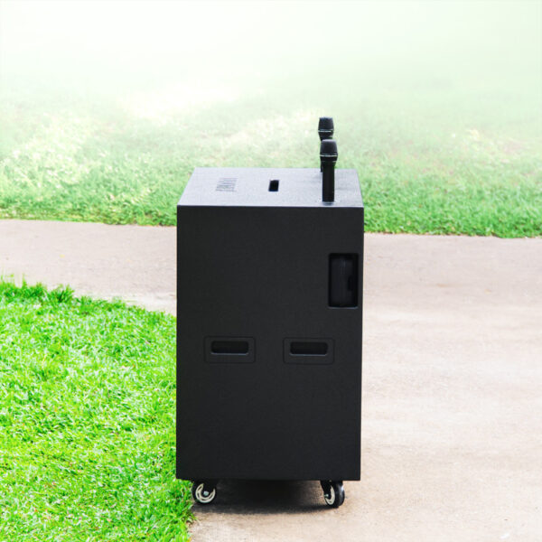 Với trọng lượng 78kg và kích thước khá lớn, nhà sản xuất đã trang bị hệ thống bánh xe chịu lực và tay cầm chắc chắn, giúp người dùng có thể dễ dàng di chuyển loa đến bất kỳ địa điểm nào. Mặt trước của loa là tấm lưới kim loại vững chãi, vừa bảo vệ màng loa khỏi những va đập không mong muốn, vừa tăng thêm vẻ sang trọng, chuyên nghiệp cho sản phẩm.