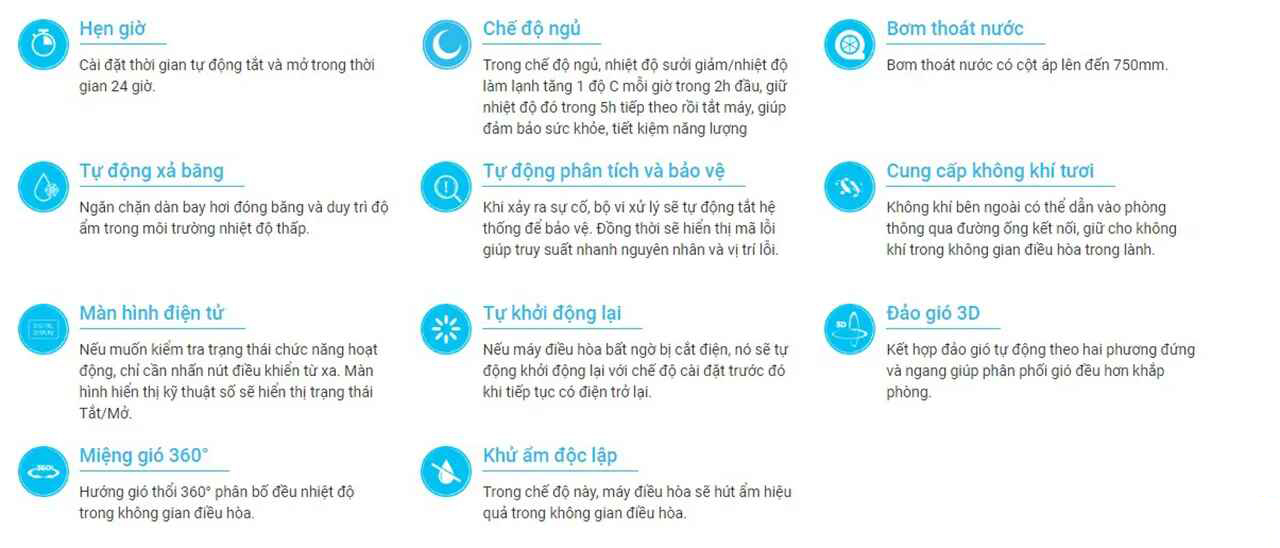 Những tính năng này giúp máy lạnh vận hành thông minh – an toàn – tiết kiệm thời gian, đúng chuẩn dòng sản phẩm hiện đại.
