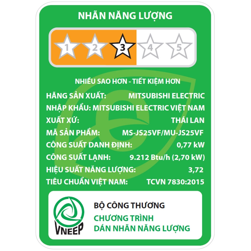 Mitsubishi Electric MS-JS25VF đạt hiệu suất năng lượng 3 sao (CSPF ~3.72), đảm bảo khả năng tiết kiệm điện vượt trội so với máy lạnh thông thường.
