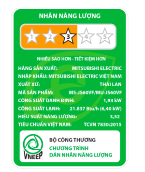 Máy lạnh Mitsubishi Electric MS-JS60VF đạt hiệu suất năng lượng CSPF ≈ 3.41 (3 sao) – mang lại khả năng tiết kiệm điện đáng kể mà không ảnh hưởng hiệu suất làm lạnh.