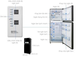 - Thiết kế: Tủ lạnh có thiết kế ngăn đá dưới, giúp bạn dễ dàng lấy thực phẩm và đá. Mặt trước của tủ thường được làm bằng chất liệu cao cấp, dễ lau chùi và tạo cảm giác sang trọng cho không gian bếp.